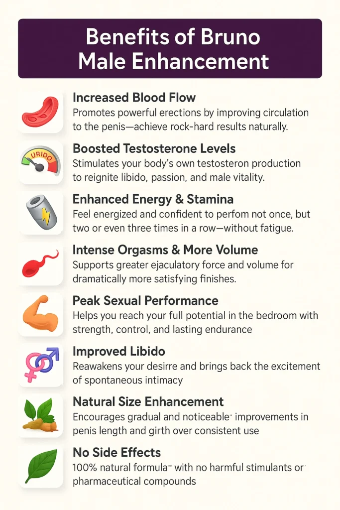 Bruno Male Enhancement was formulated to support various aspects of male sexual health using a combination of natural ingredients. Each component plays a specific role—whether it’s improving blood circulation, balancing hormone levels, or supporting energy and endurance. Below, you’ll find a breakdown of the key benefits associated with its regular use, based on the ingredients’ known physiological effects .
